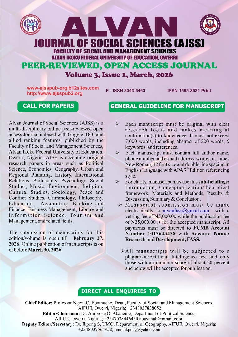 All articles published in Alvan Journal of Social Sciences (AJSS) are licensed under the Creative Commons Attribution 4.0 International License (CC BY 4.0).