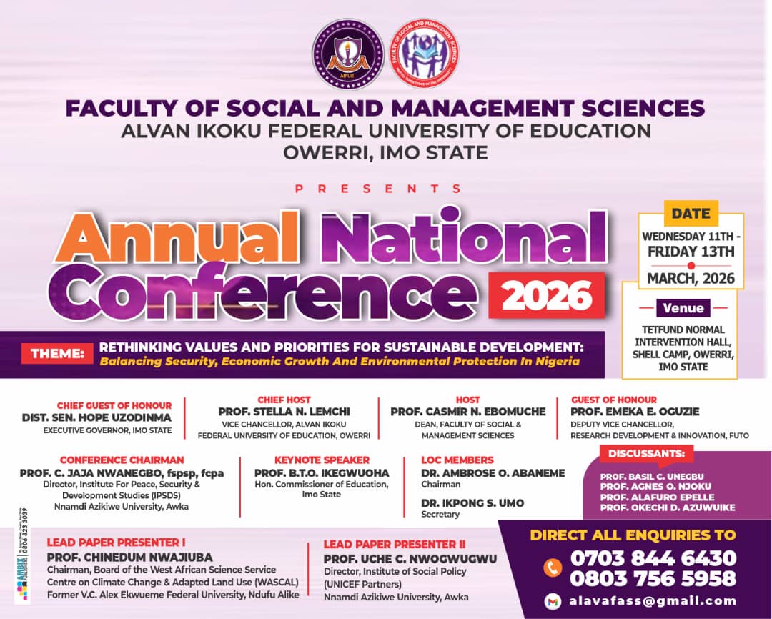 The Annual National Conference 2026, organized by the Faculty of Social and Management Sciences, Alvan Ikoku Federal University of Education, Owerri, is a national academic gathering designed to bring together scholars, policymakers, researchers, and development practitioners.